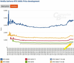 快科技2月11日消息,根据ComputerBase跟踪的RTX 50显卡走势,多数显卡在1月份价格连续几周上涨,随后趋于平稳,甚至略有下降。