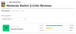 任天堂出品马里奥IP新作《马里奥网球 狂热》媒体评分已经出炉!综合多家游戏媒体评测,目前本作在MetaCritic站上的评分为77分: