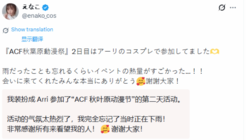 知名cosr小姐姐えなこ以阿狸的cos造型亮相ACF秋叶原动漫祭第二日活动现场。活动现场氛围十分热烈,她甚至因此忘记了当天一直在下雨。她也向所有到场支持的粉丝表达了感谢,并用中文向大家送上问候。