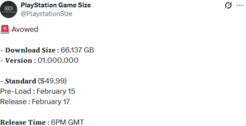 游戏资讯账号@PlaystationSize今日发布消息,确认开放世界游戏《宣誓》的PS版相关信息。该游戏PS版下载大小为66.137 GB,初始版本号为01.000.000,标准版定价49.99美元。具体时间安排为:2月15日开启预加载,2月17日正式发售,解锁时间为北
