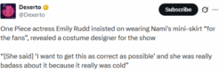 博主@Dexerto爆料,为了完美还原《海贼王》里娜美的经典造型,演员Emily Rudd在拍摄时做出了让人敬佩的选择。当时拍摄地开普敦正值寒冬,气温很低,她却坚持要穿上娜美标志性的短裙戏服,没有因为寒冷就要求更换更保暖的服装。