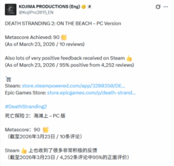 就在刚刚,小岛工作室官方发文,庆祝《死亡搁浅2:冥滩之上》PC版mc站评分升至90!正式踏入90分俱乐部,此前一直是89分。而PS5版依然是89分。