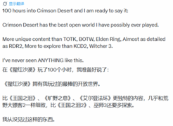 近日,有玩家在体验《红色沙漠》超100小时后给出极高评价,称其拥有 “史上最佳开放世界”。