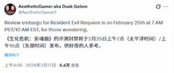 根据知名业内爆料人 Dusk Golem 的最新消息,备受期待的卡普空生存恐怖大作《生化危机9:安魂曲》的媒体评分解禁时间已经确定。