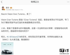 小米创办人、董事长兼 CEO 雷军今日发文称,明天,小米 Vision GT 的实车,将在西班牙巴塞罗那世界移动通信大会(MWC)与大家见面。