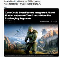 国外游戏社区r/IndianGaming有玩家发帖爆料,Xbox平台即将新增一个名为“Let AI Play”的功能按钮,该按钮可以直接让AI代替玩家进行游戏操作,这一消息引发了大量玩家的讨论与争议。