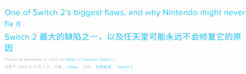 今日,外媒nintendoeverything谈及NS2最大的缺陷之一,并称任天堂可能永远不会完全修复。