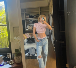 女星西德妮·斯威尼(Sydney Sweeney)又亲自为自家内衣品牌Syrn站台了。她在最近发布的一组Instagram照片中,身穿一件粉色半透明蕾丝短上衣,下身搭配同色系高腰内裤,故意将内裤边露出破洞牛仔裤的腰头,性感又随性。
