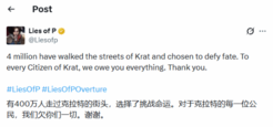 近日,类魂游戏《匹诺曹的谎言》官方X账号正式发布了游戏销量突破400万份的贺图,并配文向玩家致谢。