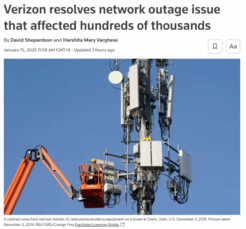 据路透社报道,当地时间1月14日,美国最大运营商Verizon宣布,已修复一场持续10小时的全国性移动通信故障,并将向受影响用户提供账户抵扣。此次故障导致大规模通话、短信和上网服务中断,波及数十万用户。