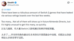 近期,Switch 2相关游戏在全球各地评级机构中迎来了一波“集中泄露潮”,引发了玩家社区的高度关注。知名任天堂粉丝博主Stealth表示,过去几周里,大量Switch 2游戏通过评级信息被曝光,这种泄露规模和速度都十分罕见。
