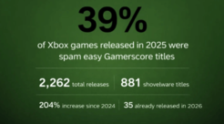据游戏媒体playground报道:TrueAchievements平台的新数据显示,2025年Xbox平台推出的游戏中,近40%是主打轻松刷取玩家积分的垃圾游戏。这一现象引发了关于商店游戏质量和成就积分通胀的质疑。