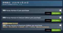 《极限竞速:地平线6》售价正式公布,标准版Steam国区定价298元,豪华版398元,高级版498元(可提前4天解锁游戏)。游戏现已开启预购,定档5月19日发售。
