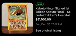 根据外媒Gamerant的消息称,在12月的第一个周末举行的一场宝可梦集换式卡牌游戏拍卖会上,一张由Kabuto King签名的初版“化石盔”卡牌最终以51100美元的价格成交(换算成人民币大约36万元)。这场线上拍卖会意义非凡,Kabuto King在社交媒体上表示,拍