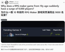 据外媒报道,由RPGmaker制作的独立游戏《Secret Of Magia》在2015年上架Steam,一直处于冷门状态,游戏原本同时在线玩家仅维持在10~50的人数。然而却在12月5日这天突然激增,在短短十分钟内从不到百人冲刺到9567人,更是在今日突破1.1万人,涨